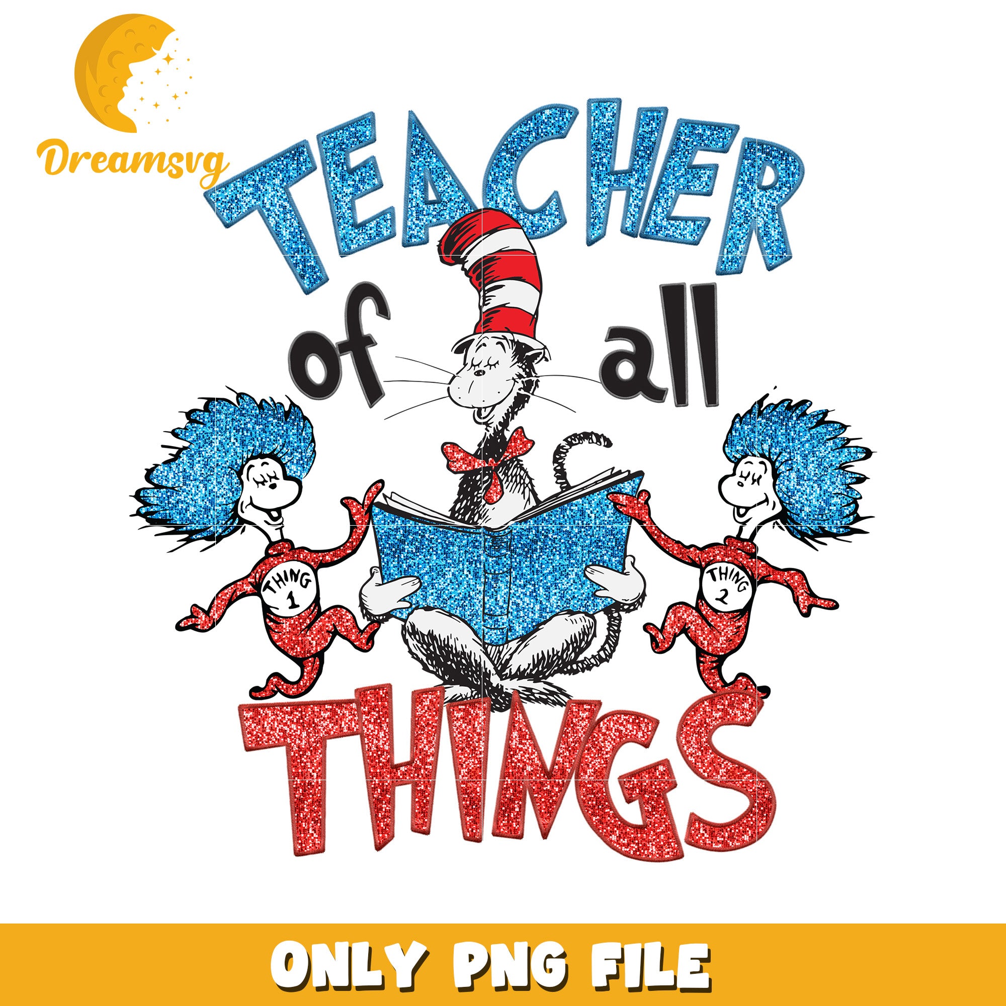 Glitter teacher of all things png is a product of our Dr. Seuss collection! Inspired by the quirky world of Dr. Seuss, this collection features high-quality designs of beloved characters like the Cat in the Hat, Thing 1 and Thing 2, and Horton. Perfect for creating fun projects like party invitations, t-shirts, and classroom decorations, these PNG files are easy to use and compatible with popular design software. Whether you're celebrating Dr. Seuss Day, creating educational materials, or making personalized gifts, our Dr. Seuss PNG collection will add a little playful magic to your creations.